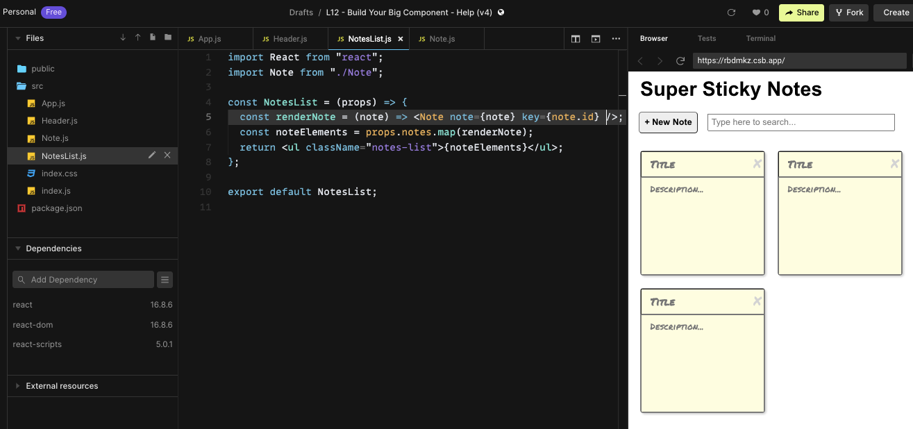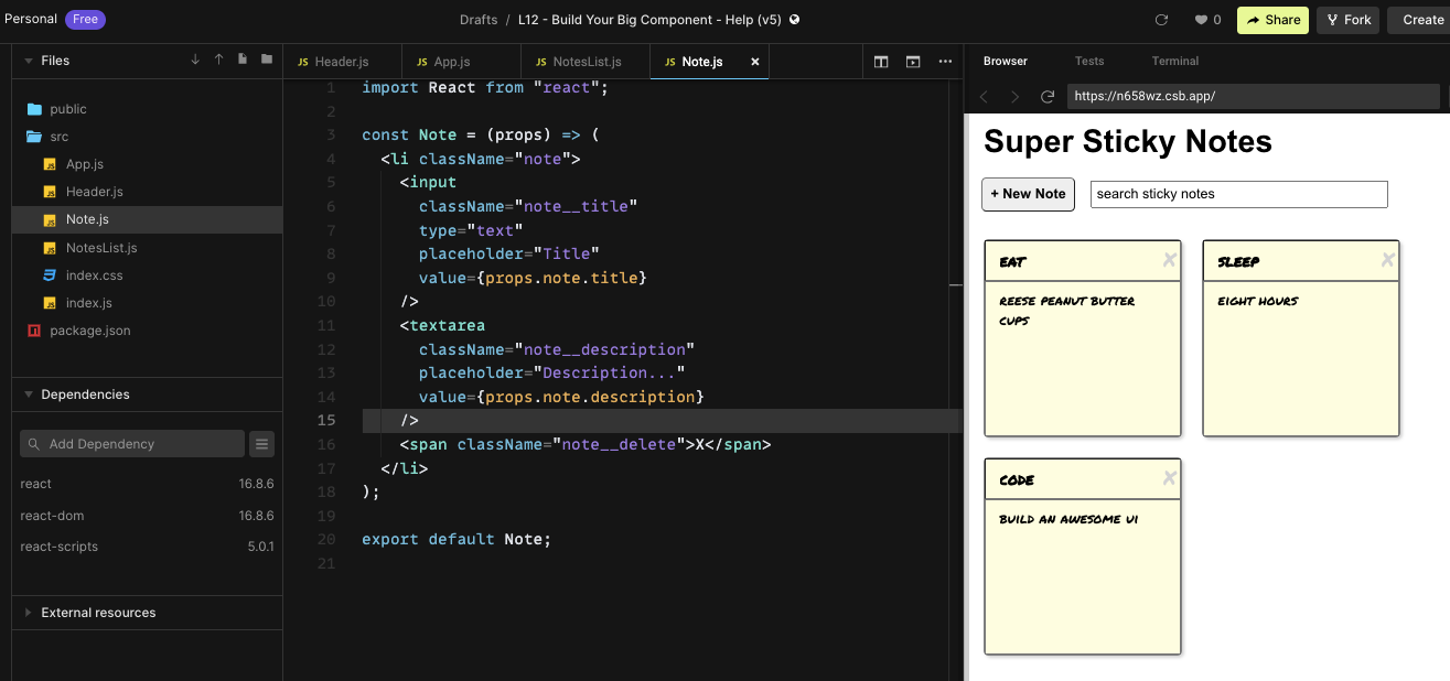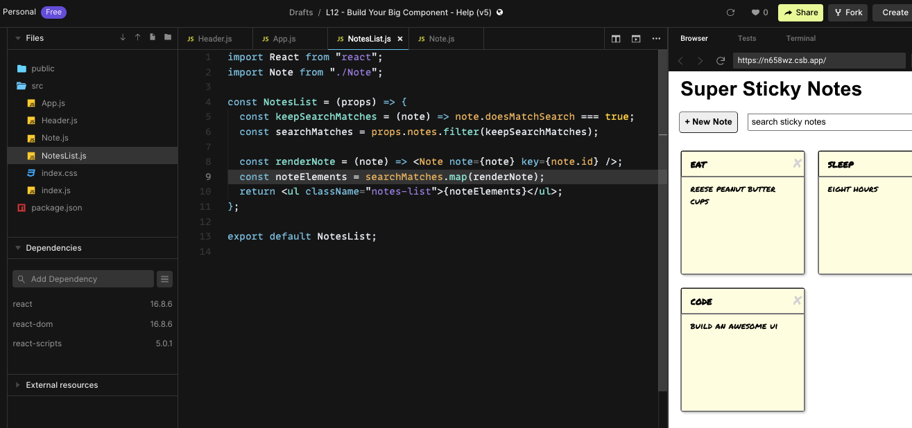 In this part of the challenge we updated the App component to have a state section. Then we placed a notes array and a search text string property.